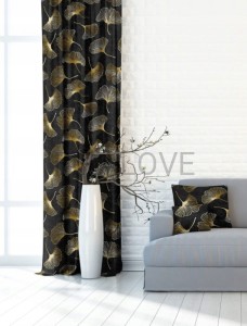 Niezwykle modne w tym sezonie czarne zasłony ze złotym roślinnym wzorem, przykuwająca wzrok kompozycja kolorów.