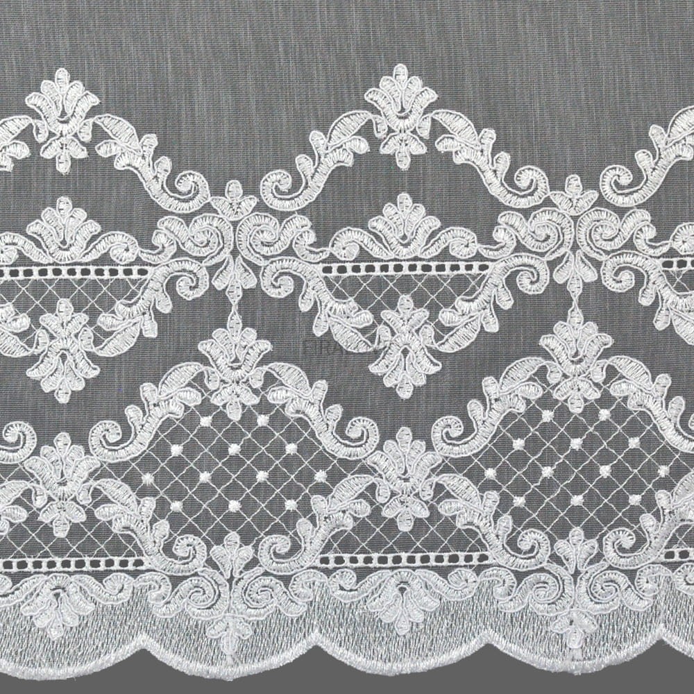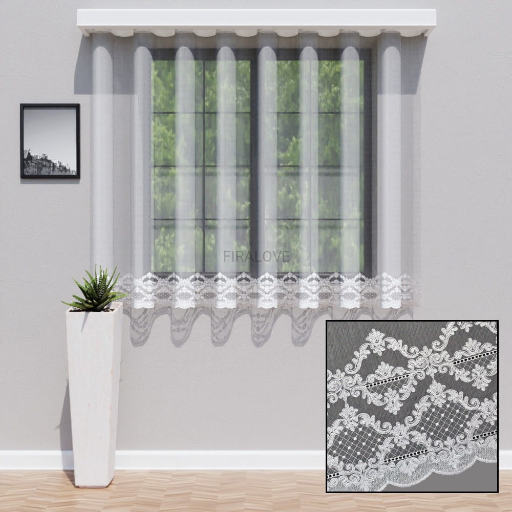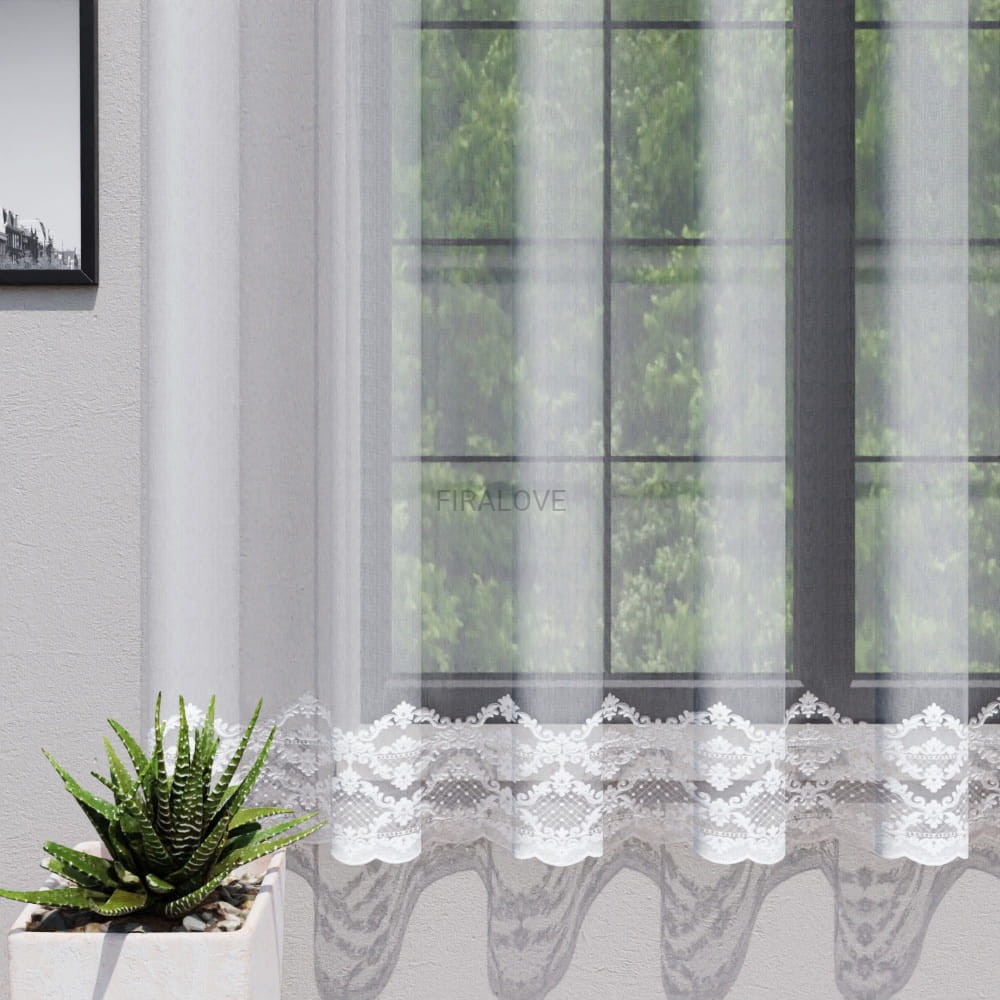 Firanka z ozdobnym haftem to doskonały wybór dla osób ceniących klasyczne i eleganckie rozwiązania w aranżacji okien. Delikatna, półprzezroczysta struktura tkaniny w połączeniu z dekoracyjnym wykończeniem tworzy harmonijną całość, która pięknie prezentuje się zarówno w kuchni, jak i w salonie czy jadalni.