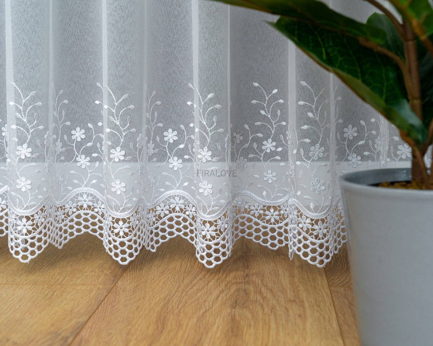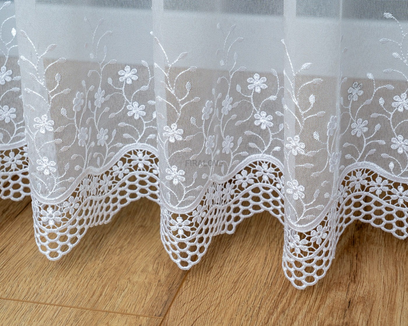 Dół firanki został udekorowany wyrazistą, ażurową aplikacją w kwiatowy wzór, która dodaje wnętrzu romantycznego i klasycznego uroku. Materiał markizeta jest przewiewny, lekko faluje, a jednocześnie dobrze się układa – to świetny wybór do salonu, sypialni, kuchni czy jadalni.